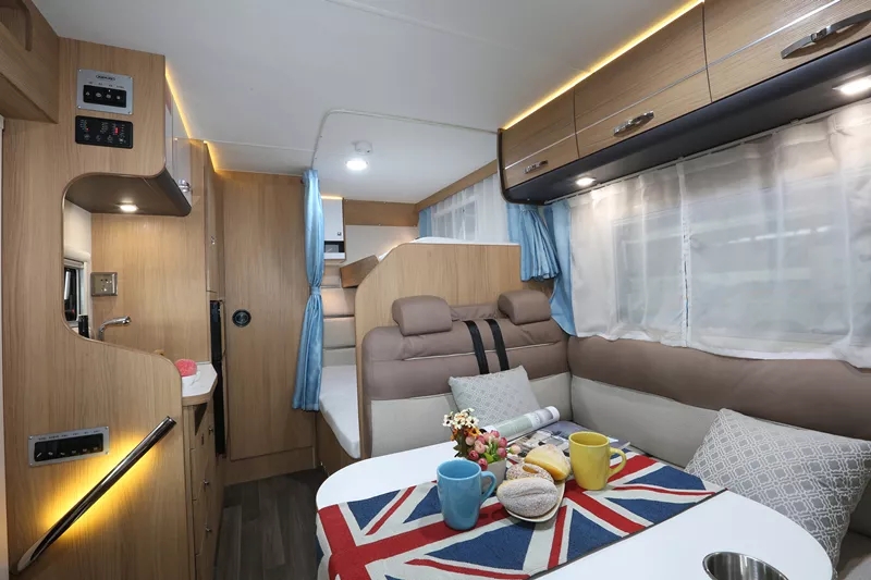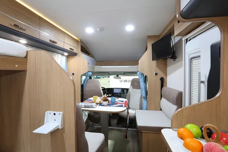 驾驶室上方双人床,卡座与升降餐桌组合成榻榻米,车厢后部纵置双人床,可满足多人睡眠需求。