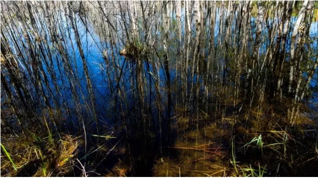 白桦林与白沙湖形成的倒影